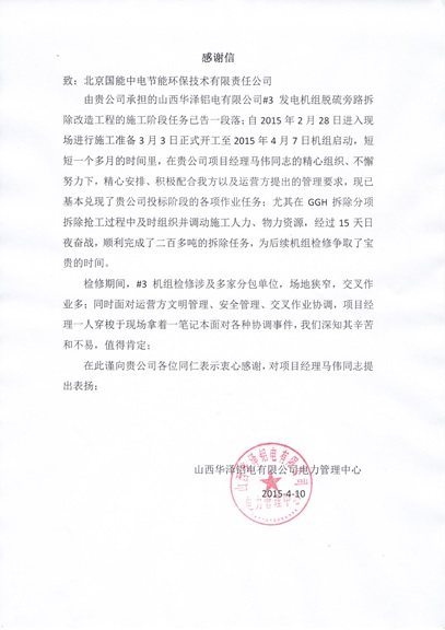 當(dāng)前位置: 國(guó)能中電公司動(dòng)態(tài)> 山西華澤鋁電旁路改造EPC項(xiàng)目受業(yè)主表揚(yáng)