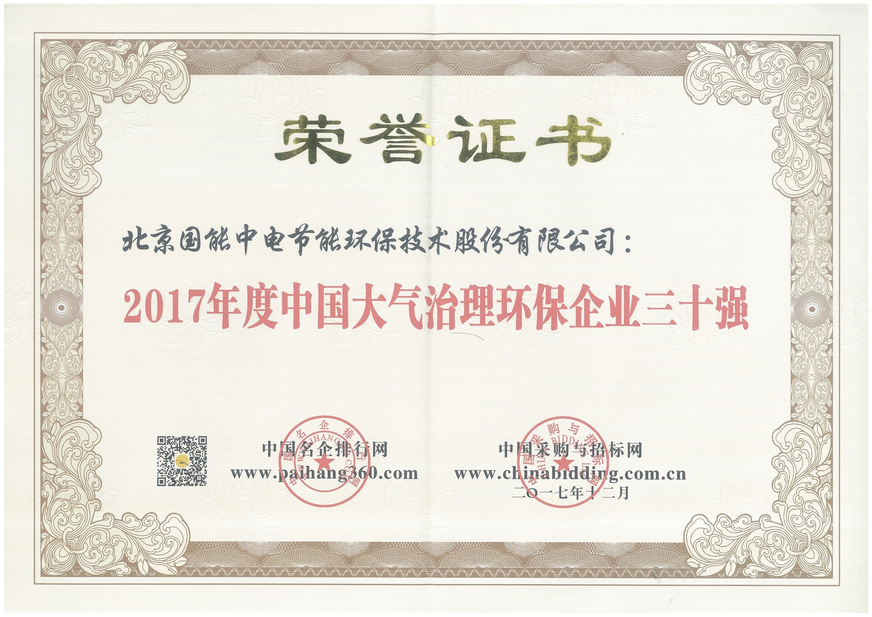 2017年度中國(guó)大氣治理環(huán)保企業(yè)三十強(qiáng)