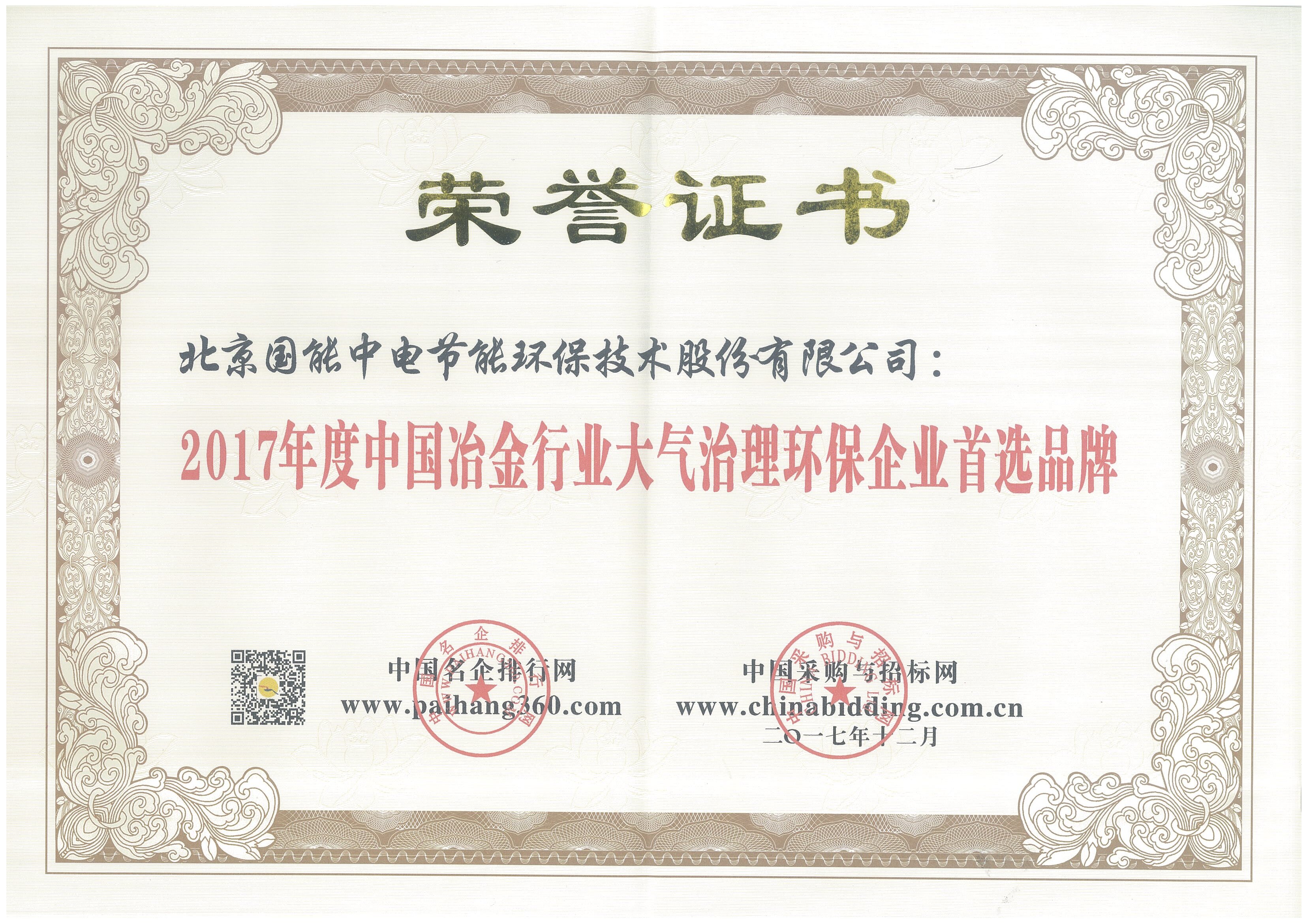 2017年度中國(guó)冶金行業(yè)大氣治理環(huán)保企業(yè)首選品牌