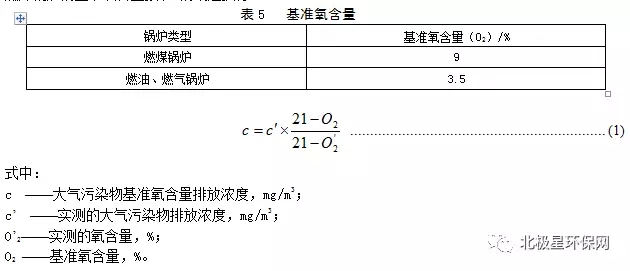 實測的鍋爐顆粒物、二氧化硫和氮氧化物排放濃度,必須按公式(1)折算為基準(zhǔn)氧含量排放濃度。燃煤鍋爐的基準(zhǔn)氧含量按表5的規(guī)定執(zhí)行。