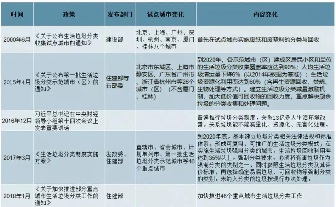 垃圾分類政策開啟廚余垃圾處理市場。2000年,北京、上海等8個(gè)城市被列為生活垃圾分類試點(diǎn)城市;2015年,26個(gè)城市(區(qū))被列為“全國第一批生活垃圾分類示范城市(區(qū))”;2017年,發(fā)改委住建部發(fā)布《生活垃圾分類制度實(shí)施方案》,要求在全國46個(gè)城市先行實(shí)施生活垃圾強(qiáng)制分類;2019年,《關(guān)于在全國地級及以上城市全面開展生活垃圾分類工作的通知》明確提出“有害垃圾、干垃圾、濕垃圾和可回收物”的生活垃圾4分類法則,并將分類范圍從原先的46個(gè)試點(diǎn)城市推廣至293個(gè)地級城市。目標(biāo)明確為,到2025年全國地級及以上城市基本建成生活垃圾分類處理系統(tǒng)。而2017年293個(gè)地級及以上城市垃圾清運(yùn)量為1.76億噸,是之前46個(gè)試點(diǎn)城市垃圾清運(yùn)量的1.85倍。