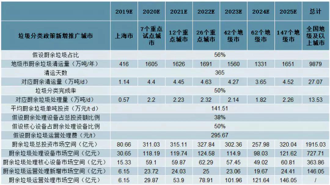 以100個(gè)餐廚垃圾試點(diǎn)城市的平均餐廚垃圾項(xiàng)目單噸投資額76.6萬元/t,處理費(fèi)197元/t作為合理估計(jì)值,可得上海環(huán)境松江、上海環(huán)境嘉定、海峽環(huán)保福州、首創(chuàng)環(huán)保寧波(一期)4個(gè)項(xiàng)目的平均廚余垃圾單噸投資額為141.5(萬元/t)??紤]到廚余垃圾的綜合處理費(fèi)較高,假設(shè)廚余垃圾處理費(fèi)是餐廚垃圾的1.5倍為295.7(元//t•d),以地級及以上城市平均每天產(chǎn)生約27萬噸廚余垃圾測算,在中性情景下(即垃圾分類完成率為50%),廚余垃圾總投資額市場空間為1915億;按廚余垃圾處理設(shè)備占總投資額的38%,核心設(shè)備占廚余處理設(shè)備的50%計(jì)算,對應(yīng)市場空間為364億;2025年廚余垃圾運(yùn)營處理市場的空間預(yù)計(jì)可達(dá)146億元,市場空間廣闊。